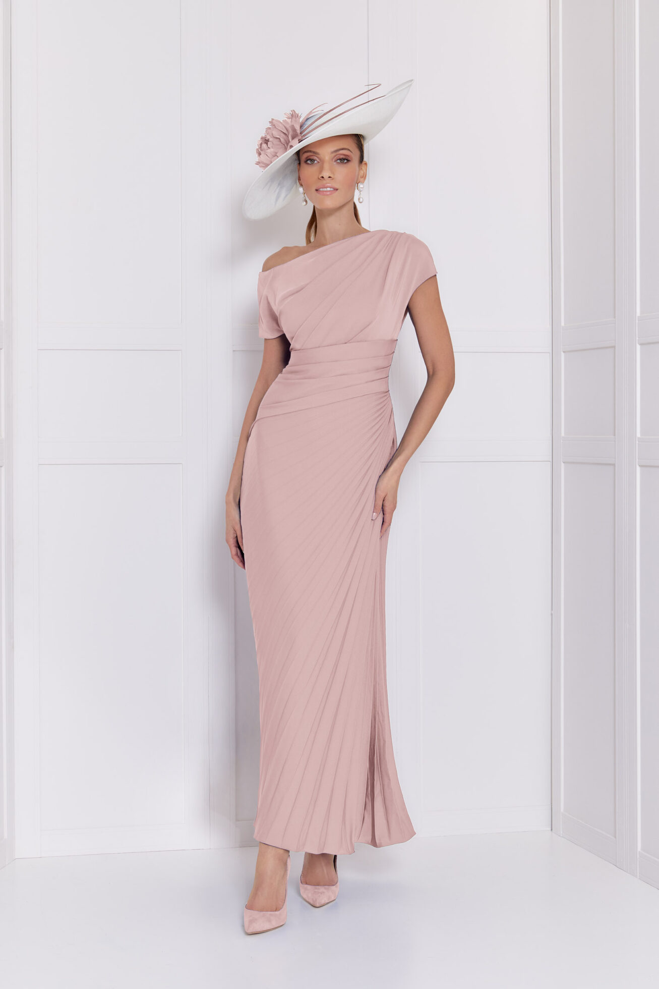 Asymetric neckline dress with plisse skirt