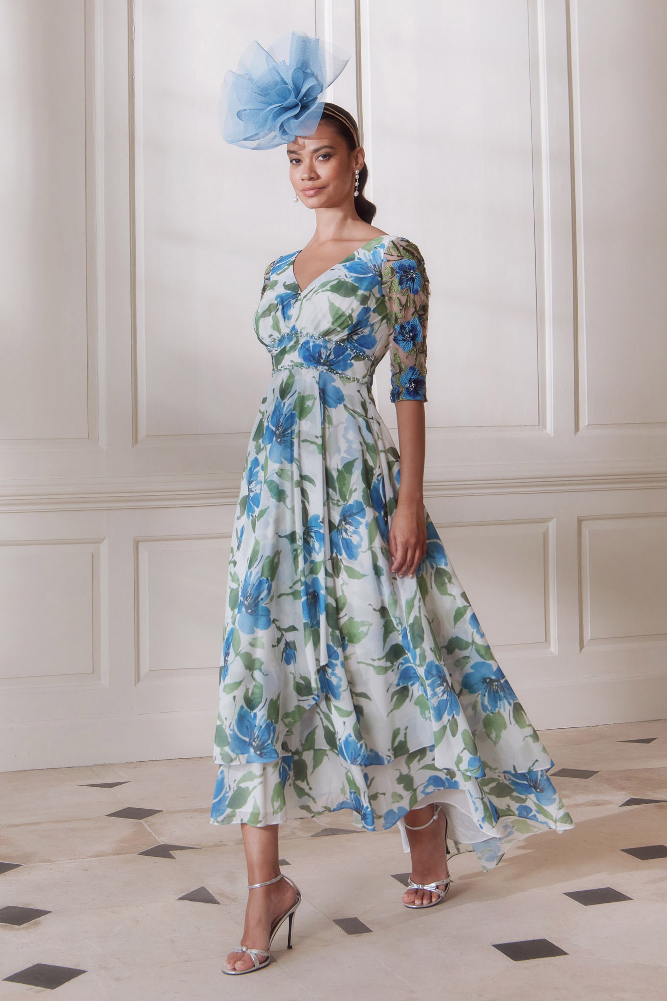 John Charles V neck A line midi dress with lace sleeves